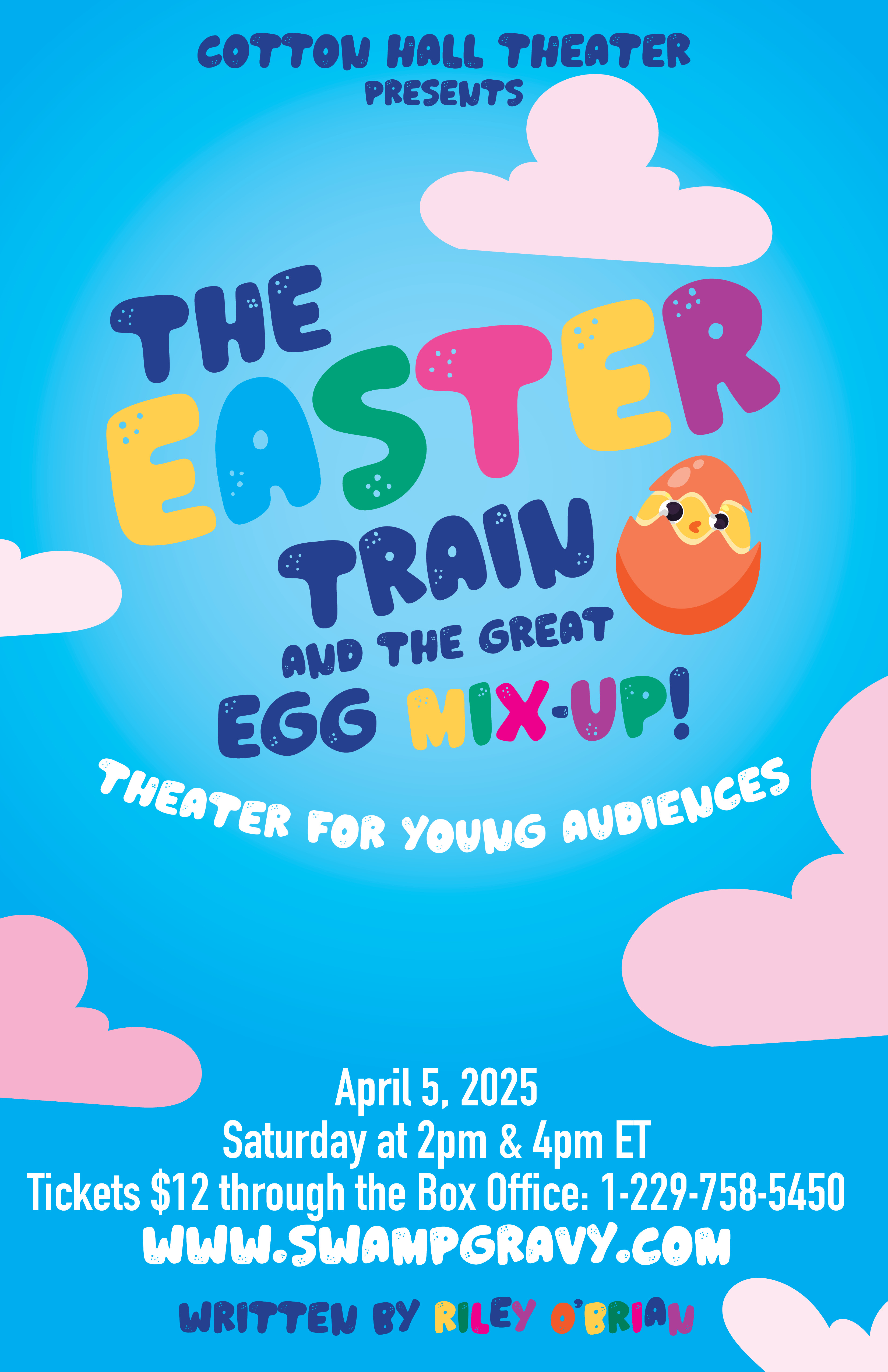 The Easter egg shipment is late, what are the bunnies to do, but wait?!? Find out in The Easter Train Cotton Hall’s first ever Theater for Young Audiences play. The play will take place in the theater’s common area and will feature an interactive story line perfect for children 1 year to 6 years old and their parents. The experience also includes an Easter craft, toy chick-adoption, and a photo with the bunnies from the play! Concessions will be available.